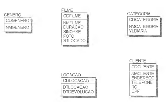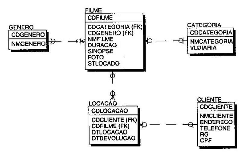 Veja os modelos de dados a seguir. Identifique os relacionamentos entre as entidades apresentadas. Leve em consideração que o Gênero é Drama, Comédia, Aventura, etc. e Categoria é a faixa de preço do filme. Em um modelo mais completo, deveria haver várias fitas para um mesmo filme, mas imagine que, nesse sistema, não haja essa necessidade.