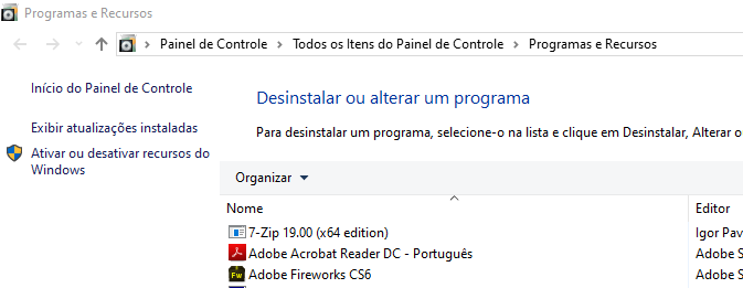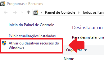 2. Clique em Ativar ou desativar recursos do Windows, no canto superior esquerdo, como indicado na imagem abaixo.