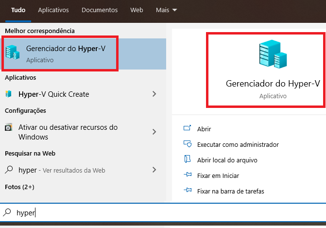 Para executar o Gerenciador do Hyper-V, no menu Iniciar, digite hyper-v e clique nas opções disponíveis, como mostrado na imagem abaixo: