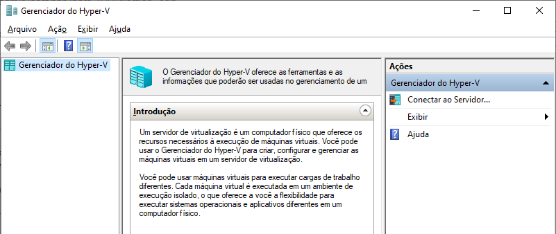 6. Pronto. Agora é só utilizar o gerenciador para executar o servidor Hyper-V e administrar suas máquinas virtuais.