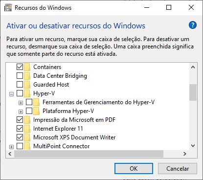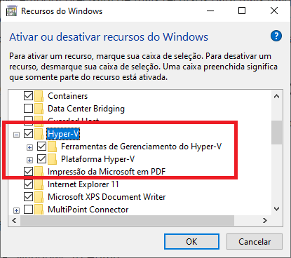3. Procure por Hyper-V e marque as opções disponíveis, como indicado na imagem a seguir: