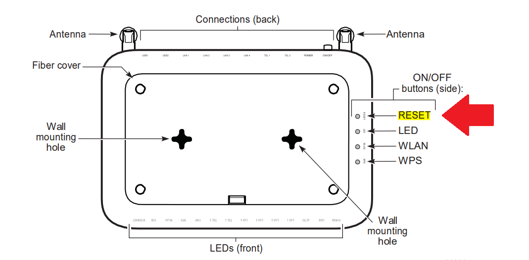 ✅ O botão RESET fica na parte de baixo do equipamento, como indicado na figura: